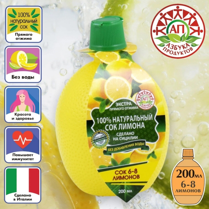 - Состав: 100% лимонный сок, без добавления сахара и консервантов