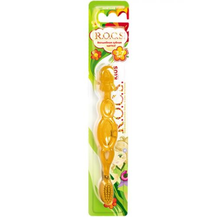 Необычная зубная щетка R.O.C.S. Kids создана с учетом потребностей детей в возрасте от 3 до 7 лет. Разработанная при участии стоматологов, она обеспечивает качественную гигиену полости рта и привлекает внимание ярким дизайном, который обязательно понравится вашему ребенку. Ручка щетки выполнена в форме волшебной палочки, на конце которой расположена фигурка одного из четырех персонажей команды R.O.C.S. Это оригинальное оформление и насыщенные цвета делают процесс чистки зубов увлекательным и веселым.