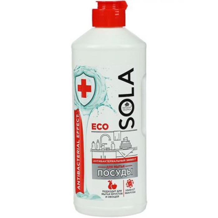 Средство для мытья посуды 'Выгодная уборка' Sola с антибактериальным эффектом обладает густой и концентрированной формулой, которая эффективно расщепляет даже самые стойкие жировые загрязнения. Оно идеально подходит для мытья посуды в холодной воде, обеспечивая безупречную чистоту и свежесть. Продукт экологически безопасен, не содержит опасных химических компонентов и не наносит вреда окружающей среде.