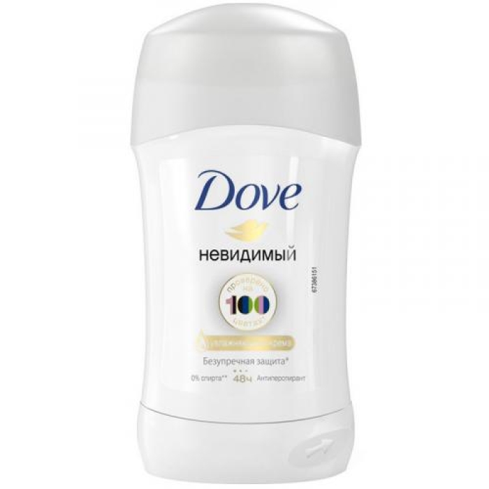Антиперспирант-карандаш Dove «Невидимый» обеспечивает надежную защиту от пота и неприятного запаха, не оставляя белых следов на одежде. Согласно проведенным тестам, он не оставляет следов на 100 различных цветах тканей, что подтверждено инструментальным тестом Unilever R&D, UK, 2013. Формула без этилового спирта и с добавлением увлажняющего крема на 1/4 помогает смягчить и успокоить чувствительную кожу подмышек, что делает его идеальным выбором для ежедневного использования.Особенности и преимущества