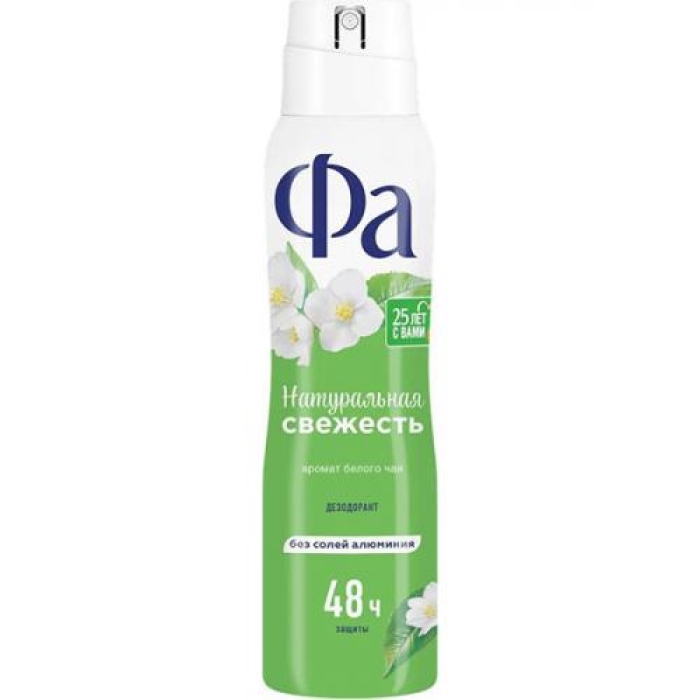 Дезодорант-аэрозоль Фа «Натуральная свежесть» обеспечивает надежную защиту от неприятного запаха на протяжении 48 часов, позволяя вам чувствовать себя уверенно и комфортно в течение всего дня. Формула продукта активно борется с бактериями, которые являются основной причиной появления запаха пота. Легкий и ненавязчивый аромат белого чая придаёт свежесть и легкость, создавая ощущение чистоты.Особенности и преимущества