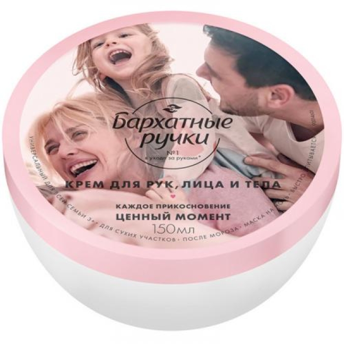 Универсальный крем «Бархатные ручки» предназначен для ухода за кожей рук, лица и тела всей семьи. Он эффективно борется с сухостью и шелушением, обеспечивая увлажнение на протяжении 24 часов. Формула крема обогащена маслами кокоса, какао и ши, которые известны своими смягчающими и восстанавливающими свойствами. Ламеллярная структура крема обеспечивает легкое нанесение и быстрое впитывание, не оставляя ощущения липкости на коже.