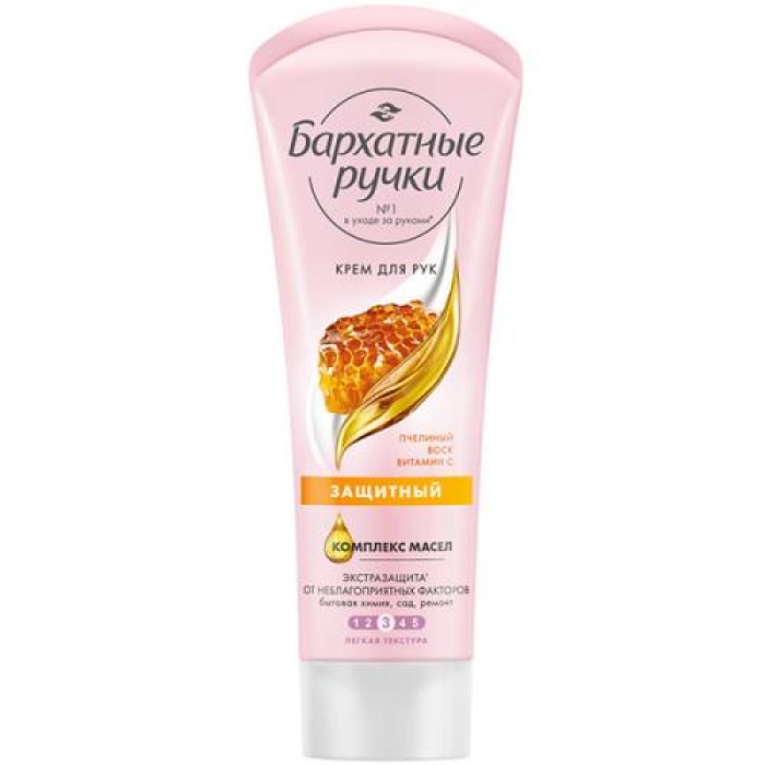 Крем «Бархатные ручки» с микромаслами и протеинами шелка обеспечивает коже рук гладкость и нежность на протяжении всего дня. Формула крема защищает от неблагоприятных факторов окружающей среды, таких как ветер, резкие перепады температур, сухой воздух, а также от воздействия бытовой химии и жесткой воды. Пчелиный воск в составе крема активно предотвращает обезвоживание кожи, сохраняя ее мягкость и эластичность.Особенности и преимущества