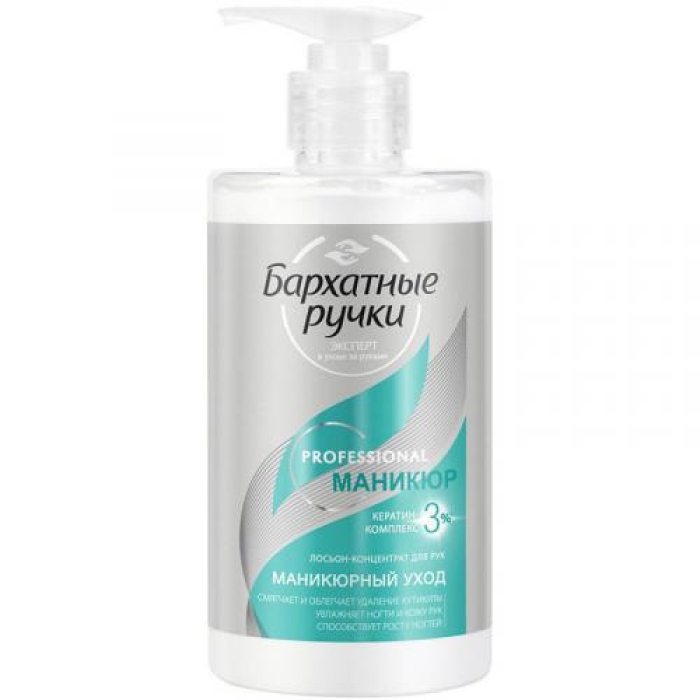 Лосьон-концентрат «Бархатные ручки» Маникюрный уход представляет собой высококачественное средство, предназначенное для профессионального ухода за руками и ногтями. Его формула разработана с учетом потребностей кожи, склонной к сухости и шелушению, а также для укрепления ломких и расслоившихся ногтей. Лосьон мгновенно смягчает кутикулу, облегчая ее удаление, и обеспечивает глубокое увлажнение как кожи рук, так и ногтевой пластины.