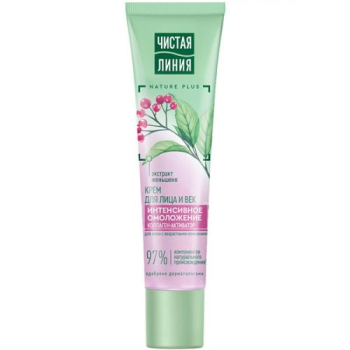 Крем 'Чистая линия Интенсивное омоложение' для лица и век — это высококачественный продукт, содержащий 97% компонентов натурального происхождения. Его активные ингредиенты направлены на борьбу с возрастными изменениями кожи, уменьшая видимость морщин и сухости, а также повышая тонус кожи. В состав крема входят растительная эссенция Nature Plus, коллаген и экстракт женьшеня, которые обеспечивают векторное воздействие на кожу, предотвращая преждевременное старение. Крем активно питает и разглаживает кожу, придавая ей эластичность и уменьшая темные круги под глазами.Особенности и преимущества