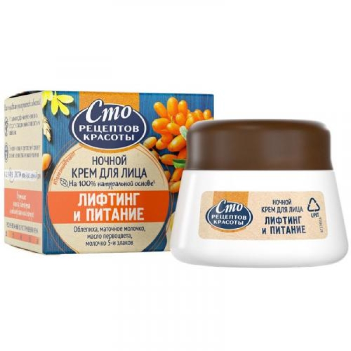 Ночной крем для лица «Сто рецептов красоты» Лифтинг и питание — это уникальный продукт, созданный для глубокого восстановления и питания кожи во время сна. В его составе находятся натуральные компоненты, такие как облепиха, маточное молочко, масло первоцвета и молочко пяти наиболее полезных злаков. Эти ингредиенты известны своими питательными и восстанавливающими свойствами, которые помогают замедлить процессы старения клеток и вернуть коже молодость и свежесть.Особенности и преимущества