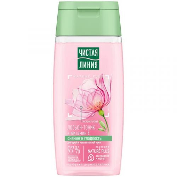 Лосьон-тоник «Чистая линия» Сияние и гладкость специально разработан для ухода за сухой и чувствительной кожей. Формула продукта включает экстракт лепестков розы и витамин E, которые оказывают успокаивающее действие, придавая коже гладкость и здоровое сияние. Эффект заметен сразу после применения, что подтверждается результатами потребительского тестирования: 80% респондентов отметили, что тоник нежно освежает кожу, 68% ощущают максимальный комфорт и свежесть, 88% заявили, что кожа выглядит отдохнувшей в течение всего дня, а 72% отметили ровный и сияющий цвет лица. В составе лосьона-тоника 97% компонентов натурального происхождения, включая эссенцию из пяти экстрактов и масел Nature Plus (экстракт вербены, экстракт пиона, масла миндаля, льна и оливы). Продукт одобрен дерматологами.Особенности и преимущества