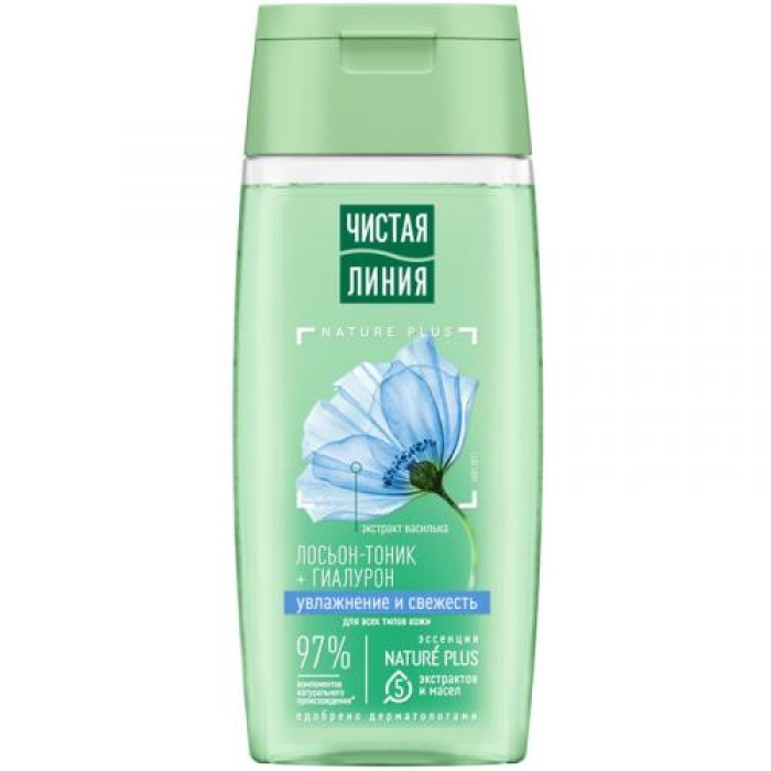 Лосьон-тоник Чистая линия Увлажнение и свежесть — это идеальный продукт для ежедневного ухода за кожей лица. Он создан на основе отвара трав и содержит 97% компонентов натурального происхождения. Активные ингредиенты, такие как эссенция из пяти экстрактов и масел Nature Plus, включают экстракты вербены, пиона, а также масла миндаля, льна и оливы. Эти компоненты обеспечивают глубокое увлажнение и тонизирование кожи, подготавливая её к нанесению крема или базы под макияж.Особенности и преимущества