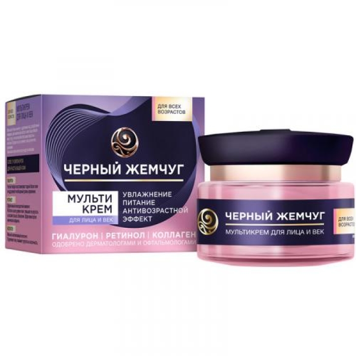 Мультикрем «Черный жемчуг» предназначен для комплексного ухода за кожей лица и век, обеспечивая как дневное, так и ночное применение. Формула крема включает 17 активных компонентов, которые способствуют улучшению состояния кожи, борясь с признаками старения. Продукт активно подтягивает, выравнивает тон и рельеф кожи, а также интенсивно питает, не оставляя жирного блеска, придавая коже здоровое сияние. Дерматологи и офтальмологи одобрили его использование, что подтверждает безопасность и эффективность.