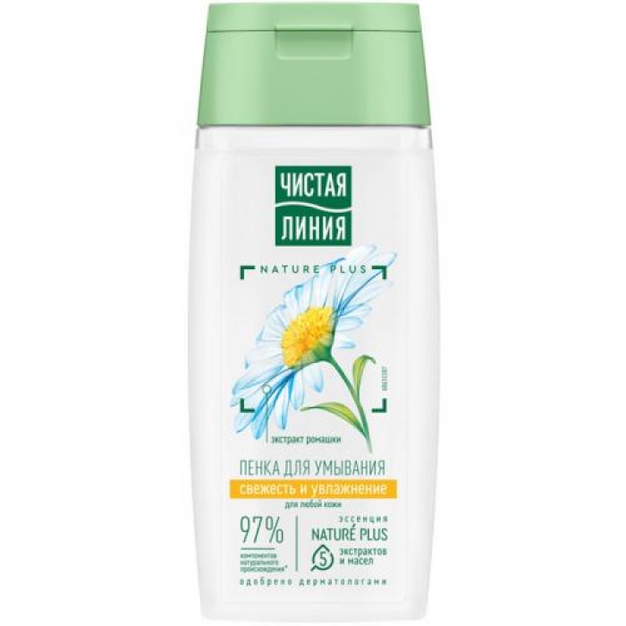 Пенка для умывания «Чистая линия» Свежесть и увлажнение предназначена для качественного очищения кожи без ощущения сухости. Она придает свежесть и сияние, увлажняя кожу благодаря 97% компонентов натурального происхождения. В состав входят активные ингредиенты, такие как эссенция из пяти экстрактов и масел Nature Plus, включая экстракты вербены и пиона, а также масла миндаля, льна и оливы. Экстракт ромашки также входит в формулу, обеспечивая дополнительное успокаивающее действие.Особенности и преимущества