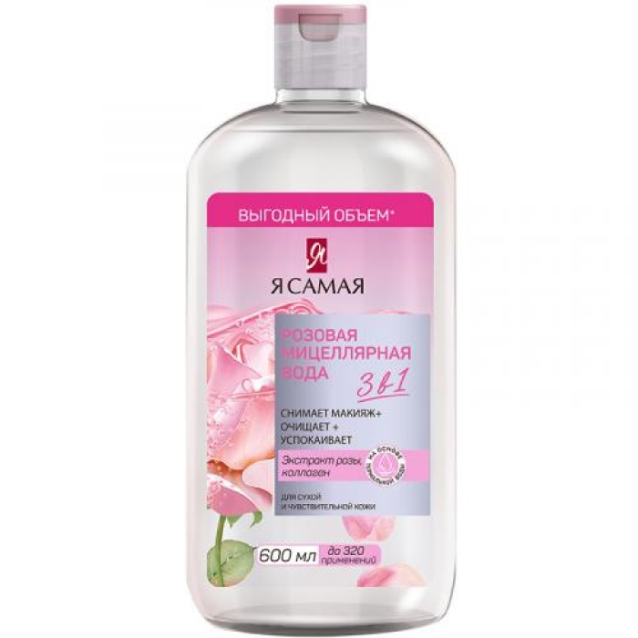 Розовая мицеллярная вода «Я Самая» предназначена для бережного очищения и снятия макияжа с сухой и чувствительной кожи. Основой формулы является термальная вода, которая известна своими увлажняющими и успокаивающими свойствами. В состав продукта также входят экстракт розы, обладающий антисептическими и противовоспалительными свойствами, и коллаген, который помогает поддерживать упругость и эластичность кожи.
