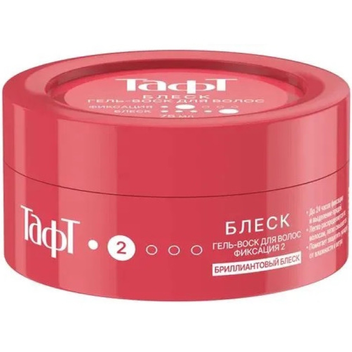Гель-воск для укладки Тафт Блеск — это идеальный продукт для создания стильной и долговечной укладки. Он придает волосам эффектный бриллиантовый блеск, который сохраняется до 24 часов. Формула гель-воска обеспечивает надежную фиксацию и разделение прядей, что позволяет создавать разнообразные прически, от естественных до более сложных.Особенности и преимущества