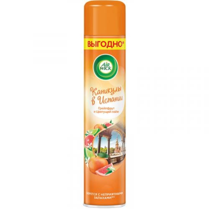 Освежитель воздуха Air Wick Каникулы в Испании Грейпфрут и цветущий лайм — это идеальное решение для создания уютной и свежей атмосферы в вашем доме. Этот продукт эффективно борется с неприятными запахами, наполняя помещение ярким и бодрящим ароматом грейпфрута и лайма. Перед использованием рекомендуется тщательно встряхнуть баллон для равномерного распределения ароматических компонентов.Особенности и преимущества