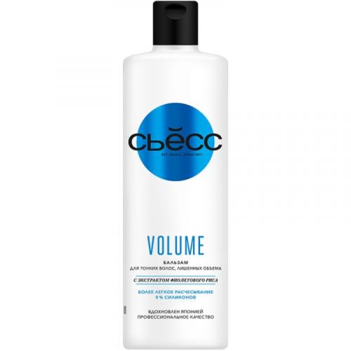 Бальзам Съесс Volume с экстрактом фиолетового риса предназначен для тонких и лишенных объема волос. Он обеспечивает заметное увеличение объема на срок до 48 часов, придавая волосам легкость и воздушность. Формула бальзама не содержит силиконов, что позволяет избежать утяжеления волос и обеспечивает естественный вид. Бальзам облегчает процесс расчесывания, делая волосы более послушными и гладкими.