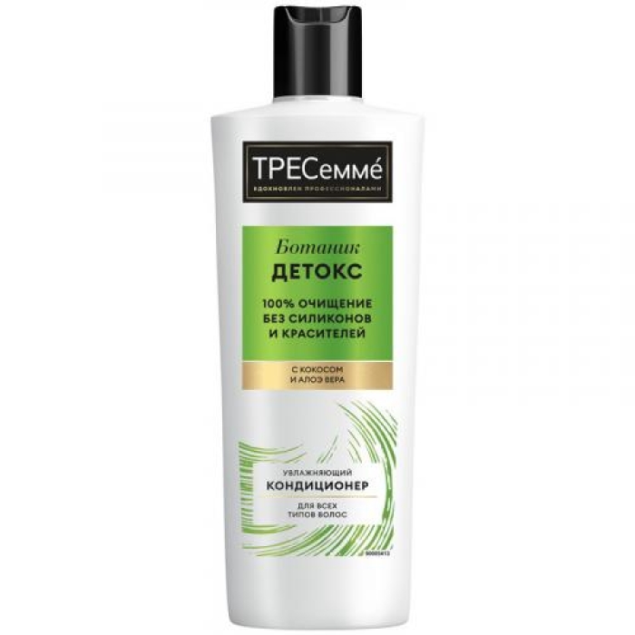 Кондиционер «Ботаник Детокс» от Тресемме предназначен для всех типов волос и обеспечивает 100% очищение без использования силиконов и красителей. Формула, обогащенная экстрактами кокоса и алоэ вера, активно увлажняет волосы, придавая им мягкость и облегчая процесс расчесывания. Нежный аромат кокоса создает ощущение свежести и комфорта при использовании.Особенности и преимущества