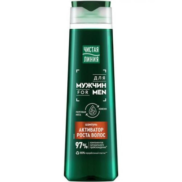 Мужской шампунь «Чистая линия» для активации роста волос содержит 97% компонентов натурального происхождения, что обеспечивает бережное очищение волос и кожи головы. Формула шампуня обогащена экстрактом перечной мяты и кофеином, которые активно питают кожу головы, способствуя стимуляции роста волос и укреплению их структуры. С первого применения волосы становятся на 45% более сильными, что подтверждено результатами потребительского тестирования.Особенности и преимущества