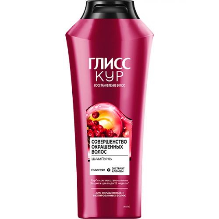 Шампунь «Глисс Кур Совершенство окрашенных волос» предназначен для бережного очищения окрашенных и мелированных волос. Он эффективно защищает яркость цвета на протяжении 12 недель, восстанавливая структуру волос после химической обработки. Формула шампуня обогащена гиалуроном и экстрактом клюквы, которые способствуют увлажнению и питанию волос, придавая им здоровый блеск и эластичность.Особенности и преимущества