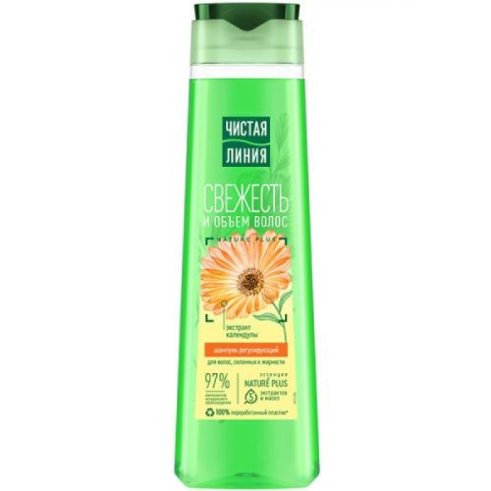 Шампунь регулирующий Чистая линия Свежесть и объем для волос, склонных к жирности, обеспечивает длительное ощущение свежести и легкости. Формула с вытяжками из календулы, шалфея и тысячелистника нормализует работу сальных желез, уменьшая жирность кожи головы и придавая волосам объем на срок до 48 часов. Состав шампуня на 97% состоит из компонентов натурального происхождения, что делает его безопасным для регулярного использования.Особенности и преимущества