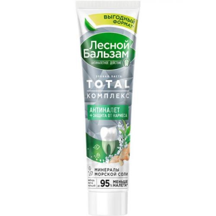 Зубная паста Лесной бальзам Total Комплекс с морской солью, экстрактом имбиря и чаем матча предлагает комплексную защиту полости рта благодаря 95% ингредиентов натурального происхождения. Эта формула обеспечивает глубокое очищение и эффективно борется с зубным налетом, который является основной причиной кариеса, изменения цвета зубов и проблем с деснами.