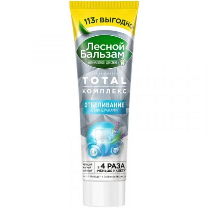 Отбеливающая зубная паста Лесной бальзам Total Комплекс Отбеливание с минералами создана с учетом современных требований к уходу за полостью рта. Состав пасты на 95% состоит из компонентов природного происхождения, что делает ее безопасной и эффективной для ежедневного использования. Паста содержит на 50% больше очищающих частиц, что способствует качественному отбеливанию зубов и поддержанию их естественной белизны.