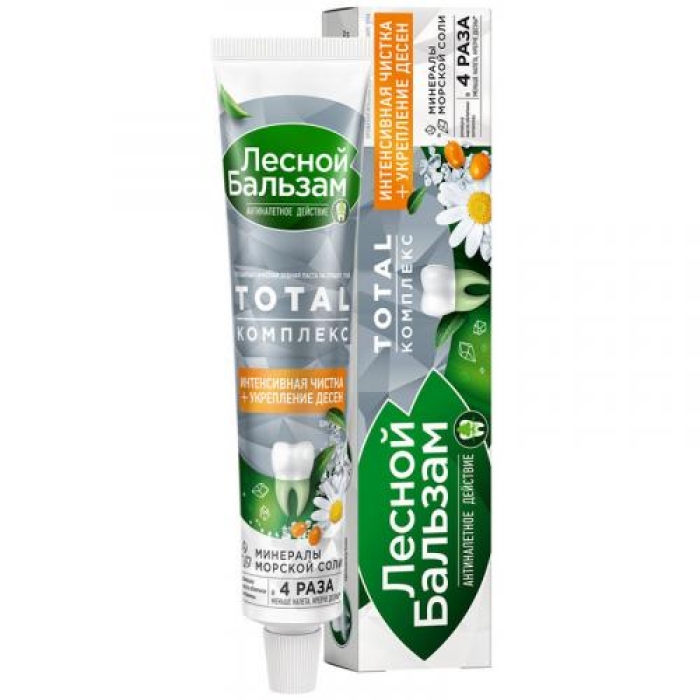 Зубная паста «Лесной бальзам Total Комплекс» с морской солью, ромашкой и облепихой обеспечивает интенсивное очищение зубов, укрепляет десны и гарантирует комплексную защиту всей полости рта. Уникальная формула пасты направлена на борьбу с зубным налетом, который является основной причиной развития кариеса, изменения цвета зубов и образования зубного камня. Благодаря содержанию на 50% большего количества очищающих частиц, паста эффективно удаляет налет даже в труднодоступных межзубных промежутках, защищая от проблем с деснами и образования зубного камня. Клинические исследования подтверждают: использование пасты снижает количество налета в 4 раза и укрепляет десны.