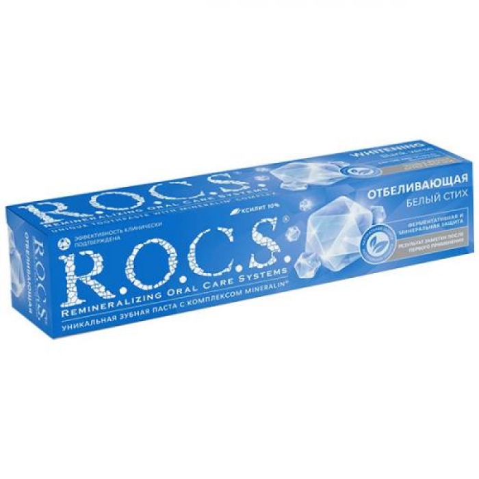 Паста для зубов R.O.C.S. «Отбеливающая. Белый стих» предназначена для людей старше 18 лет, стремящихся к осветлению зубной эмали и поддержанию ее блеска. Этот продукт подходит для ежедневного использования и сочетает в себе эстетические и терапевтические свойства. Паста эффективно удаляет налет, замедляет рост бактерий в полости рта, освежает дыхание и способствует здоровью десен.