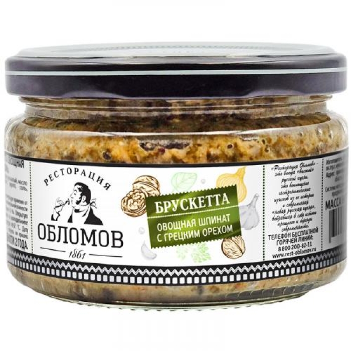 Брускетта овощная от ресторации Обломов с шпинатом и грецким орехом — это изысканная закуска, которая сочетает в себе свежесть и насыщенность вкусов. Свежий шпинат, богатый витаминами и минералами, в сочетании с грецким орехом, который является источником полезных жиров и антиоксидантов, создают гармоничное сочетание для истинных гурманов. Легкая острота чеснока и пряные нотки специй придают этому продукту особую изюминку, делая его идеальным для намазывания на хрустящий хлеб или в качестве соуса к мясным и овощным блюдам.