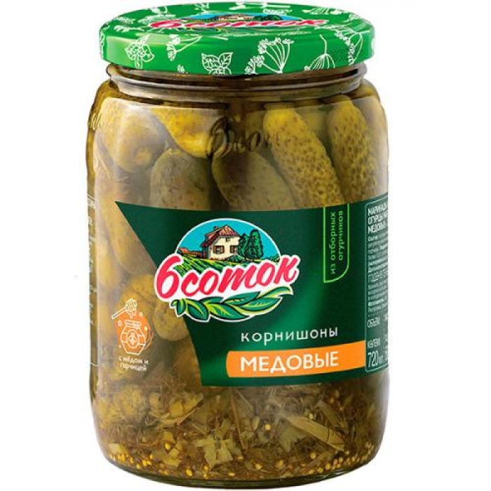 Корнишоны 6 соток маринованные медовые — это изысканная закуска, которая станет отличным дополнением к любому столу. Эти корнишоны изготавливаются из свежесобранных огурцов, которые законсервированы в первые часы после сбора, что позволяет сохранить их хрустящую текстуру и насыщенный вкус. Добавление натурального меда и свежей зелени придает продукту уникальный сладковатый оттенок, который гармонично сочетается с пикантностью огурцов.