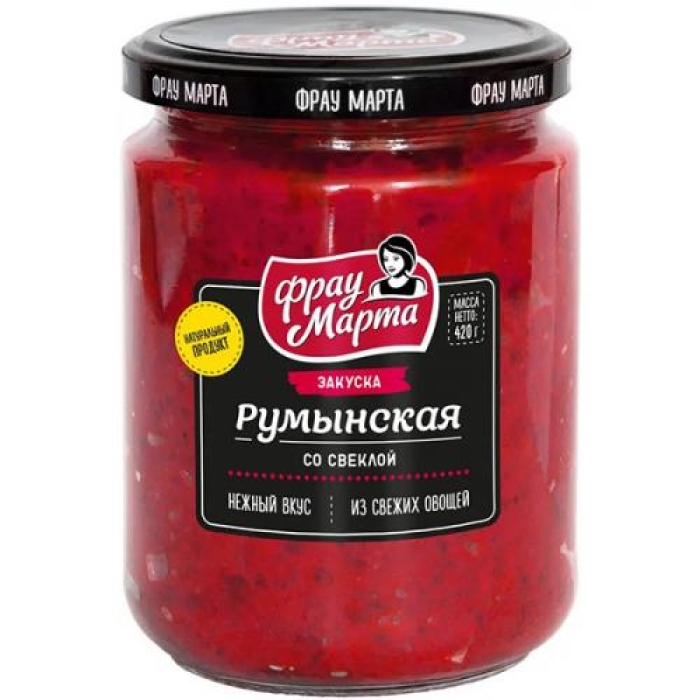 Овощная закуска «Румынская» со свеклой от бренда «Фрау Марта» представляет собой гармоничное сочетание свежих овощей, которое не только радует вкусом, но и обогащает рацион полезными веществами. Эта закуска может служить как самостоятельным блюдом, так и идеальным гарниром к основным блюдам, добавляя яркие нотки и питательную ценность.Особенности и преимущества