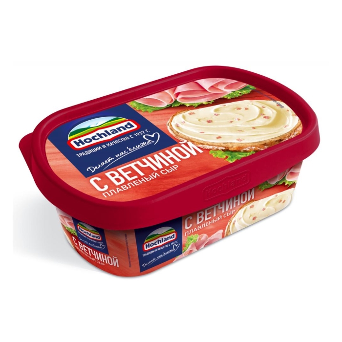 Сыр плавленый «Хохланд» с ветчиной 55% — это продукт, который сочетает в себе нежный вкус плавленого сыра и аппетитный аромат ветчины. Он идеально подходит для приготовления сэндвичей, закусок и различных блюд, добавляя им насыщенный вкус и кремовую текстуру. Благодаря высокому содержанию жира, сыр обладает отличной плавкостью и легко намазывается на хлеб.