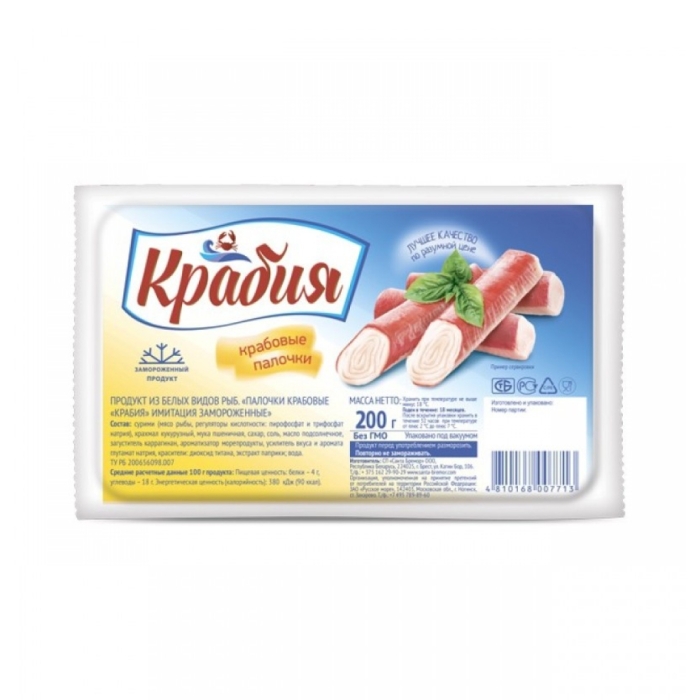 - Состав: крабовые палочки, вода, крахмал, яичный белок, соль, сахар, консерванты